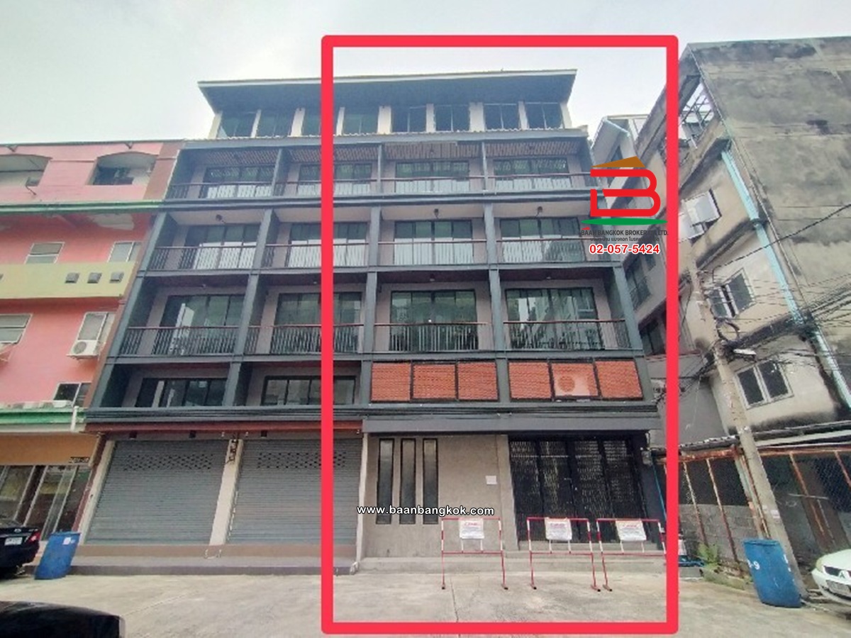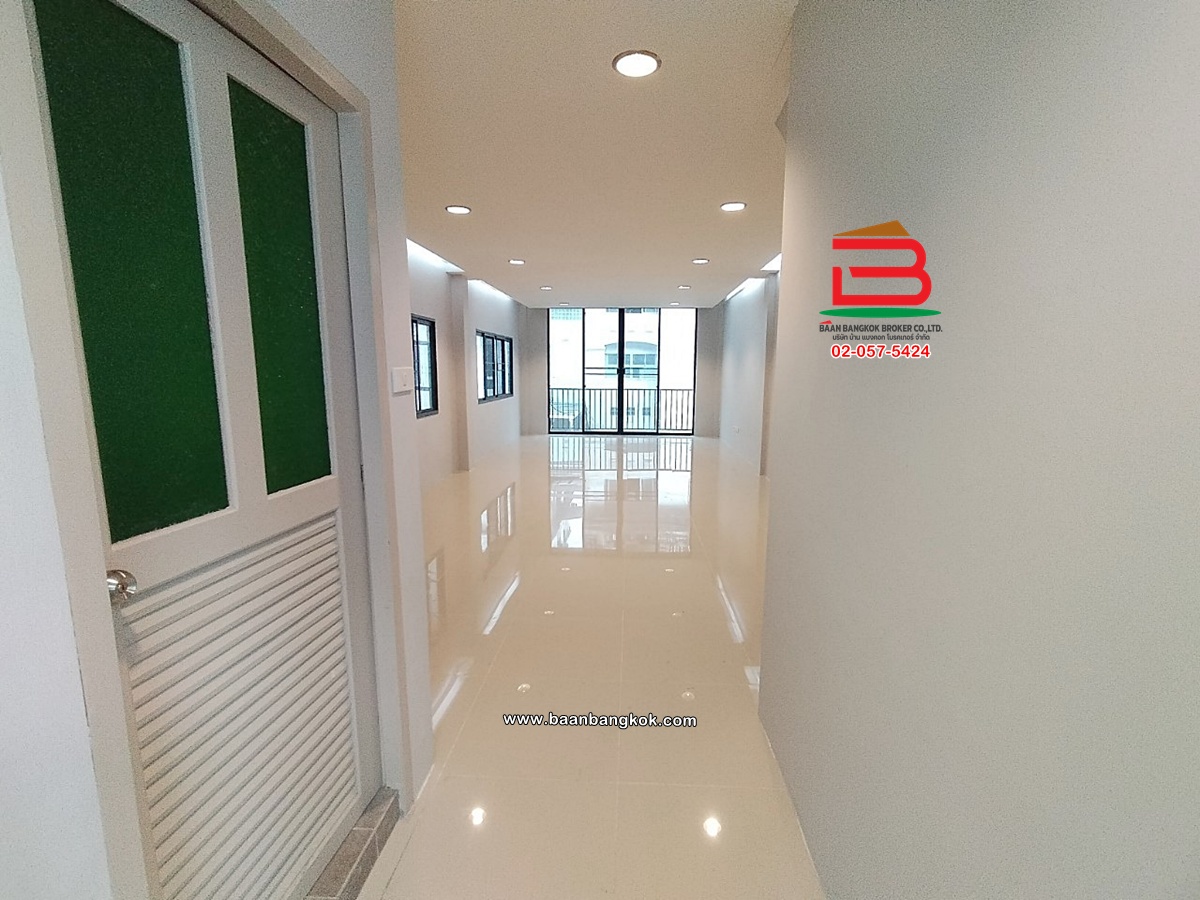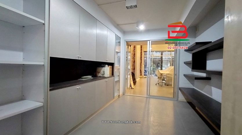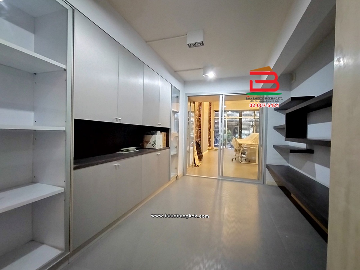 การตกแต่ง: ตกแต่งสวย สไตล์โมเดิร์น ชั้นล่างตกแต่งเป็นออฟฟิศสำนักงาน มีห้องประชุมใหญ่ พื้นปูด้วยกระเบื้อง เฟอร์นิเจอร์บิวท์อิน แอร์ฝังและแบบแขวน 4 เครื่อง ตกแต่งวอลเปเปอร์ ห้องน้ำทุกชั้น ติดไฟดาวน์ไลท์ ชั้น 2-4 กั้นห้อง สามารถตกแต่งเป็นห้องทำงาน ห้องผู้บริหาร ห้องพักผ่อน เหมาะสำหรับทำห้องผู้บริหาร ห้องทำงาน โชว์รูมแสดงสินค้า มีชั้นลอยไว้เก็บเอกสาร ชั้น 5 เป็นลานอเนกประสงค์ เหมาะสำหรับทำเป็นสำนักงาน/คลังสินค้า/โชว์รูม/กลุ่ม Startup หรือ SME