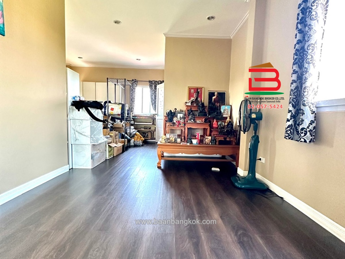 การตกแต่ง : ออกแบบสไตล์โมเดิร์น พื้นล่างปูแกรนิตโต้ พื้นบนปูลามิเนต ตกแต่งผ้าม่าน ห้องนอน Master Bedroom ชั้น 2 มีโซน walk-in closet ภายในติดเหล็กดัด กั้นโซนครัวเป็นสัดส่วน ติดตั้งเคาน์เตอร์ครัว มีปั้มน้ำ+แท็งค์น้ำ แอร์ 2 เครื่อง มีสิ่งอำนวยความสะดวก อาทิ รปภ.24 ชม., CCTV