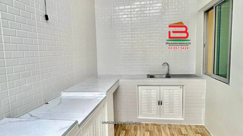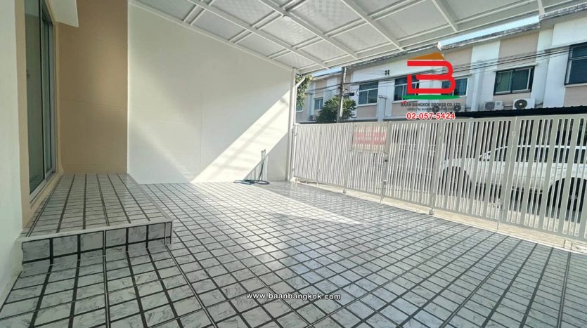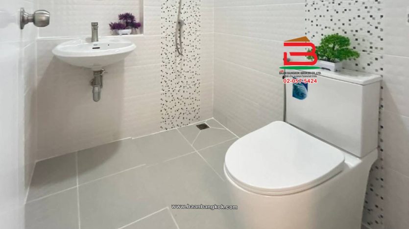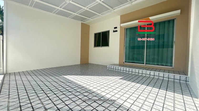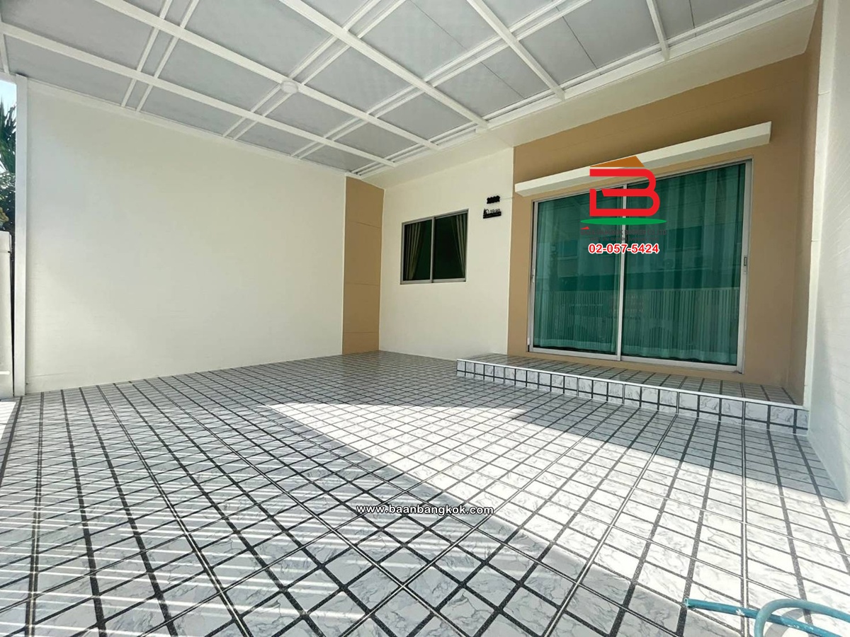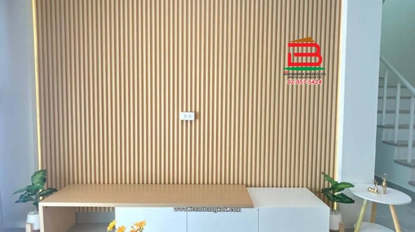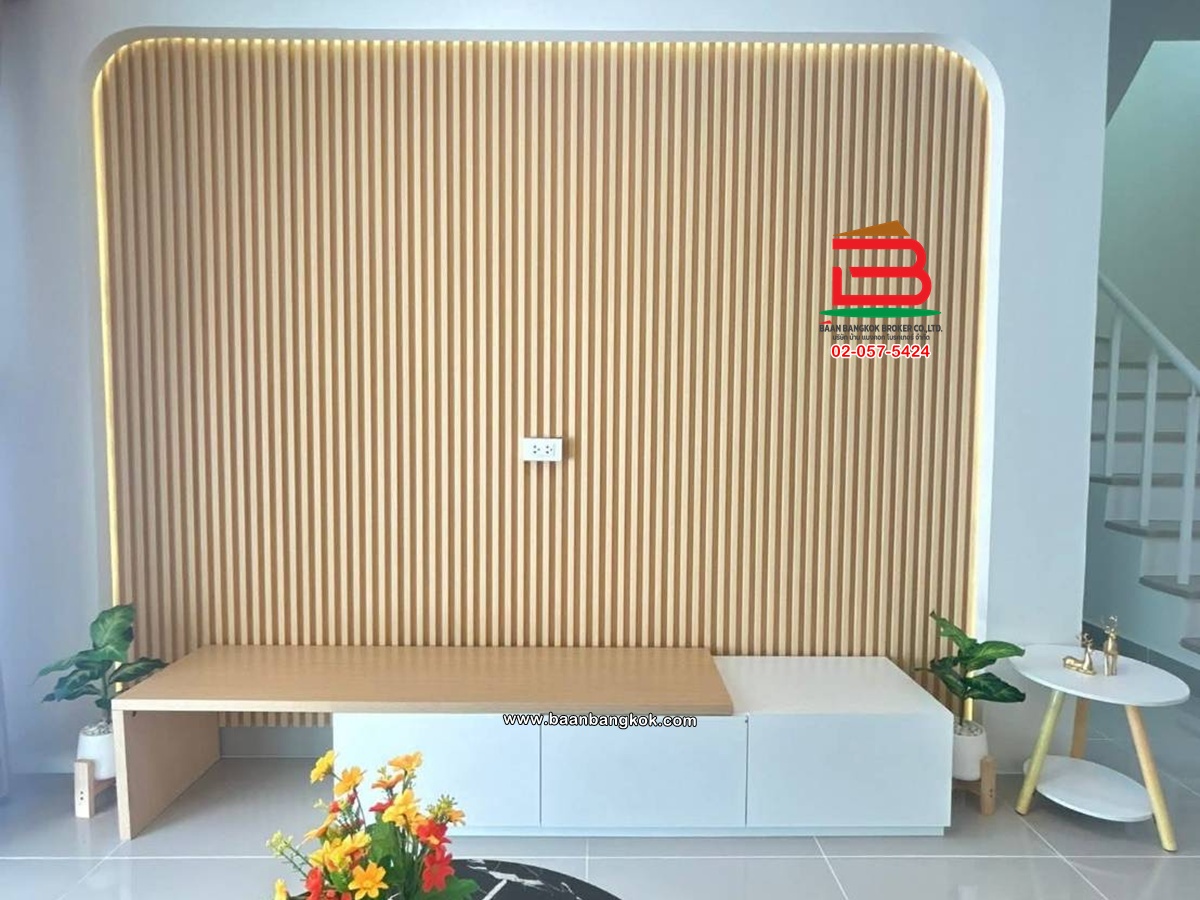 การตกแต่ง : พื้นชั้นล่างปูด้วยกระเบื้องแกรนิตโต้ พื้นชั้นบนปูกระเบื้อง บันไดเป็นไม้ยางพาราประสาน ต่อเติมหลังคาโรงจอดรถ,ห้องครัว และปูพื้นกระเบื้อง พร้อมแอร์ 2 เครื่อง มีสิ่งอำนวยความสะดวกอาทิ เช่น รปภ.24 ชม., CCTV, สนามเด็กเล่น