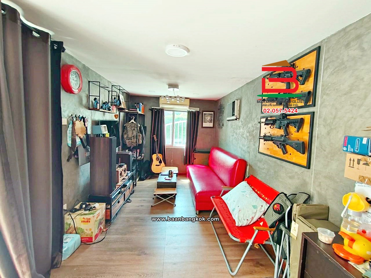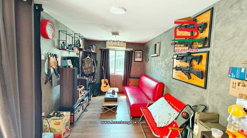 การตกแต่ง : พื้นชั้นล่างปูกระเบื้อง ชั้นบนปูปาร์เก้ ต่อเติมโรงจอดรถและ built in ครัวด้านหลัง ภายในบ้านติดเหล็กดัด+มุ้งลวด+ปั้มน้ำแท็งค์น้ำ+แอร์ ด้านนอกมีบ้านอเนกประสงค์ชั้นเดียว 1 ห้อง ในโครงการมีสิ่งอำนวยความสะดวก อาทิ เช่น รปภ.24ชม., CCTV