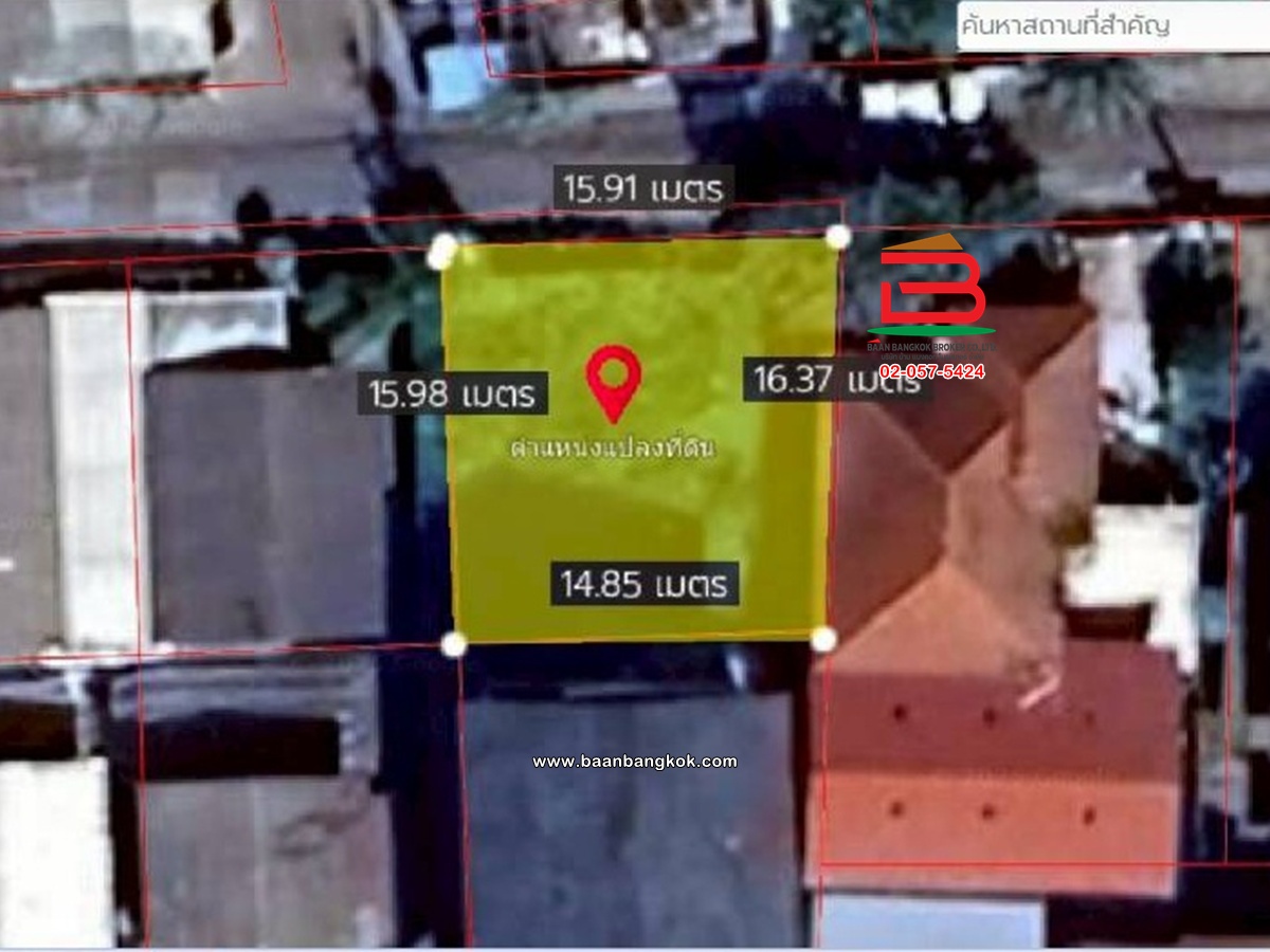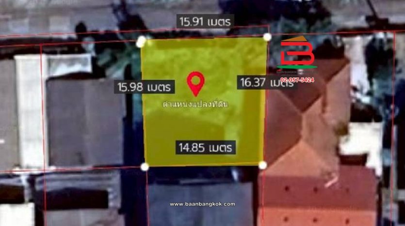 ประเภททรัพย์สิน : ที่ดินเปล่า (ถมแล้ว) หน้ากว้าง 16 เมตร ลึก 16 เมตร ล้อมรั้วอย่างดี หน้าแปลงหันทางทิศตะวันตกเฉียงเหนือ