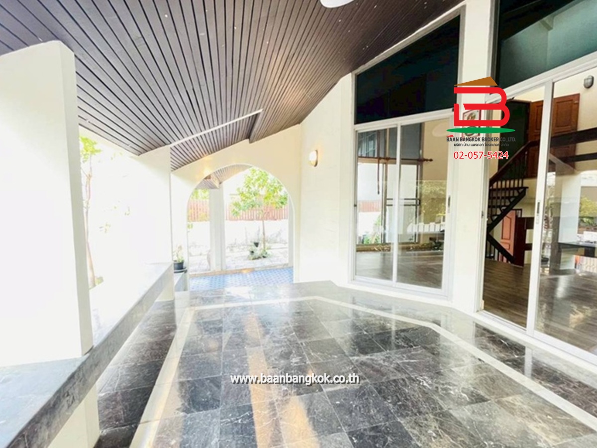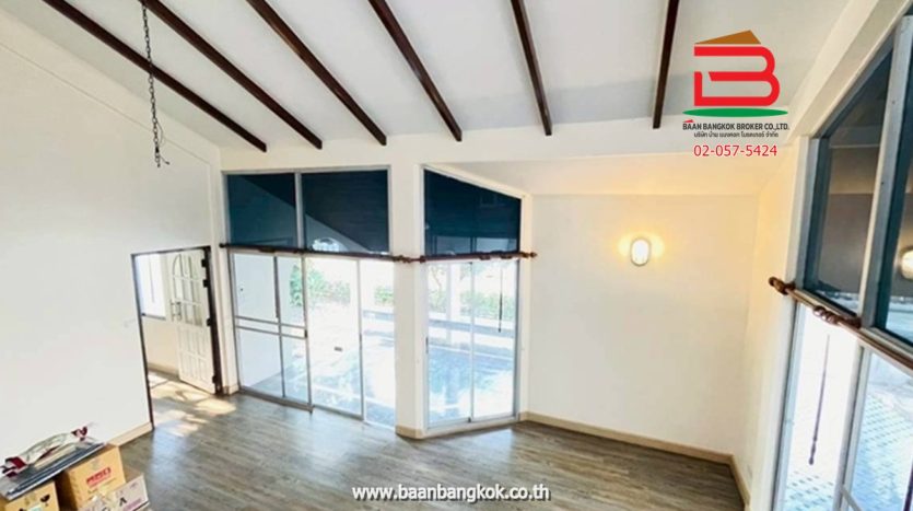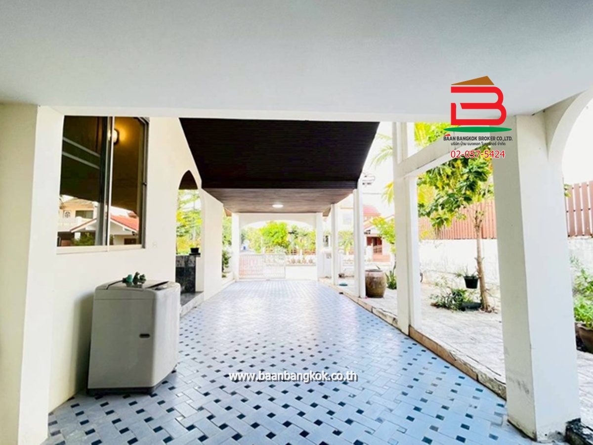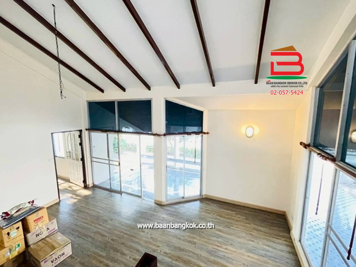 การตกแต่ง : ห้องครัวบิวท์อินสวยงาม พร้อมใช้หลังบ้าน มีพื้นที่ใช้สอยกว้างขวางรอบตัวบ้านมีสนามรอบบ้านพื้นปูแกรนิตโต้ ติดมุ้งลวด บันไดในบ้านเป็นไม้เนื้อแข็ง ชั้น 2 พื้นปูกระเบื้องยางไม้ มี 2 ห้องนอน มีระเบียงสร้างไว้เป็นมุมนั่งเล่น และห้องนอนเล็กติดมุ้งลวด มีห้องน้ำ 1 ห้อง(ทะลุหากัน) 1 ห้องโถง ทำเป็นฟิตเนสออกกำลังกายได้ ชั้นล่างมีห้องน้ำในบ้านหนึ่งห้อง ห้องน้ำนอกบ้านอีก 1 ห้องและห้องเก็บของ มีระเบียงหน้าบ้าน มุมบ้านเล่นระดับโปร่งโล่งสวยงาม ในโครงการมีสิ่งอำนวยความสะดวก อาทิ เช่น CCTV รปภ.24ชม. สนามเด็กเล่น สโมสร
