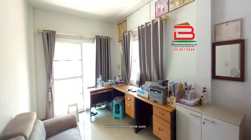 การตกแต่ง : บ้านหันหน้าออกไปทางทิศตะวันออก อยู่ติดถนนเมนหลัก บ้านสวยสะอาดพื้นห้องชั้นล่างจะปูด้วยกระเบื้อง Cotto ชั้นบน จะปูด้วยลามิเนต ฝ้าเพดานเป็นฝ้าเรียบ โซนหน้าบ้านต่อเติมโรงจอดรถพร้อมปูกระเบื้องให้เรียบร้อย พื้นบริเวณหน้าบ้านและข้างบ้านตอกเสาเข็มให้เรียบร้อย โซนหลังบ้านต่อเติมห้องครัวพร้อมเคาน์เตอร์ และมีพื้นที่สามารถปลูกไม้ดอกไม้ประดับหรือพืชผักสวนครัวตามความต้องการภายในบ้านติดแต่ตัดมุ้งลวดแถมแอร์ 3 เครื่องภายในโครงการมีสิ่งอำนวยความสะดวกอาทิเช่น รปภ 24 ชั่วโมงสนามเด็กเล่น บรรยากาศหมู่บ้านเงียบสงบเพื่อนบ้านน่ารักอัธยาศัยดีแอเรียโลเคชั่นแวดล้อมไปด้วยห้างสรรพสินค้าศูนย์หน่วยงานราชการต่างๆตลาดนัดชุมชนการเดินทางเข้าออกสะดวกสบายหลายเส้นทาง ” ทรัพย์ส่วยทำเลดีน่าลงทุน ”